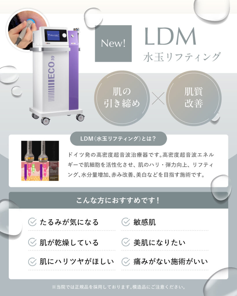 LDM(エルディーエム)は、ドイツ発の高密度超音波を使用した美肌治療で、「水玉リフティング」とも呼ばれる、肌にやさしい次世代の美容施術です。