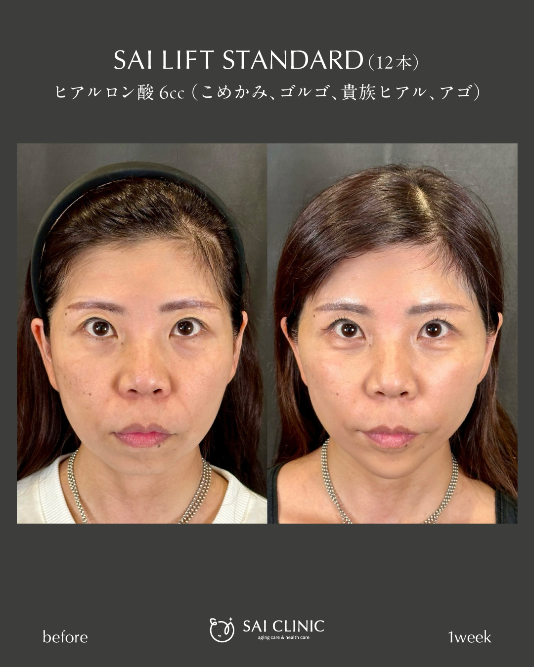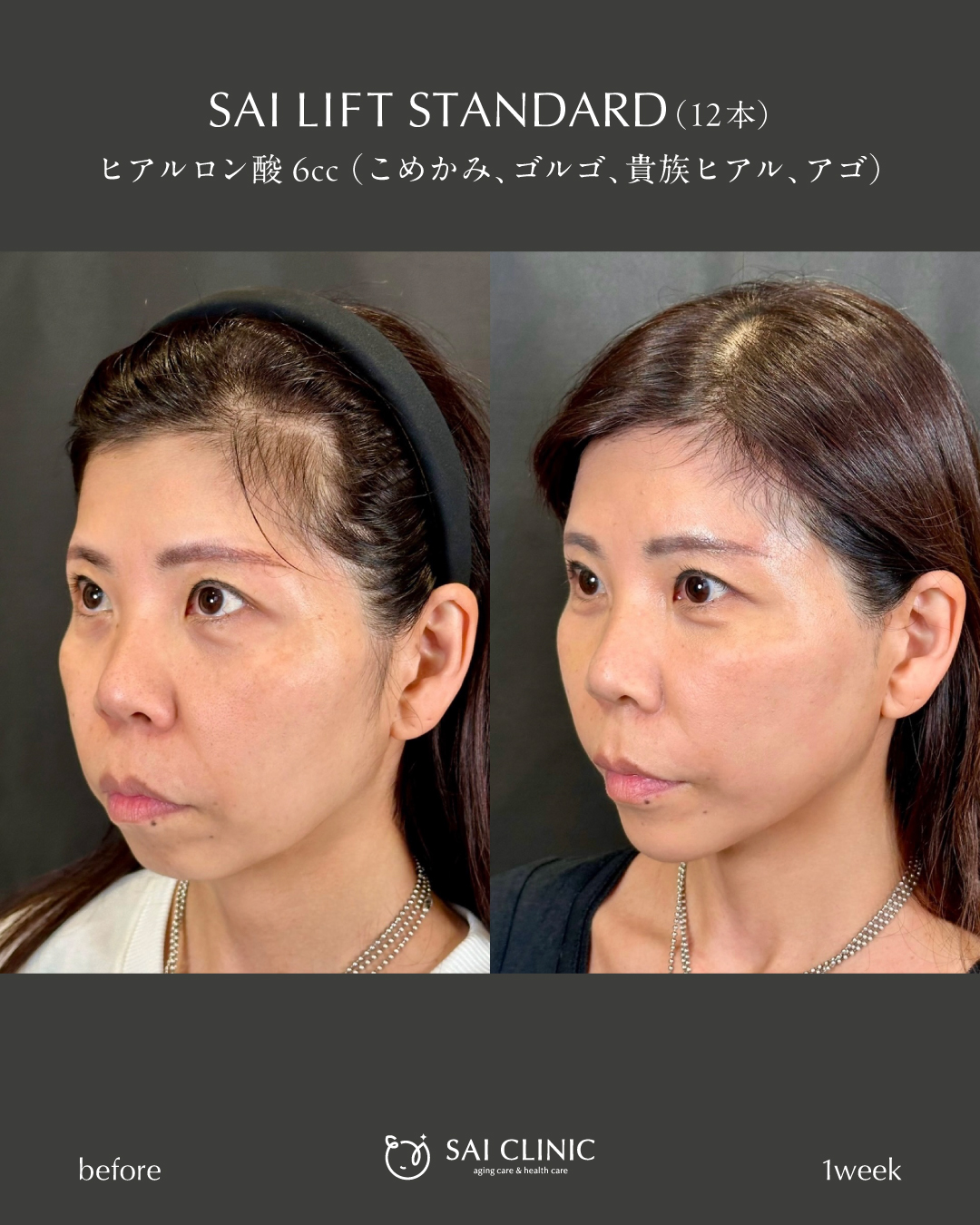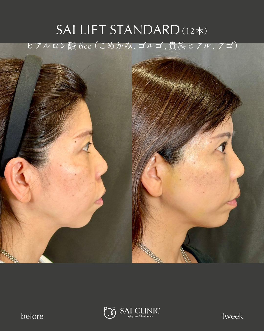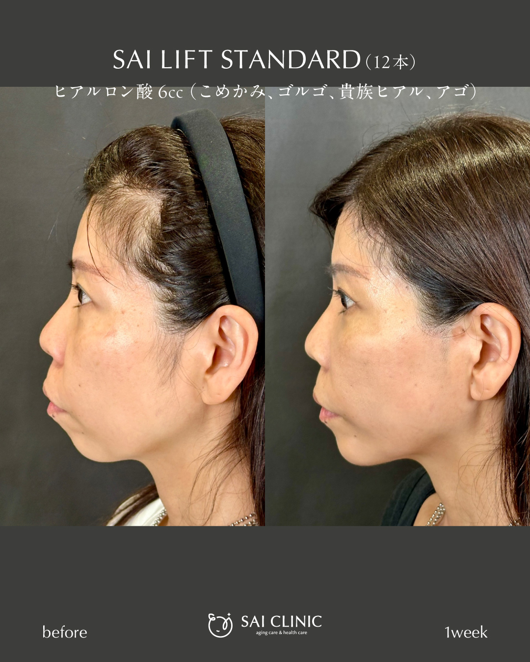 | 施術名 | 糸リフト(SAI LIFT STANDARD)12本 ヒアルロン酸(こめかみ、ゴルゴ線、ほうれい線、アゴ)6cc |