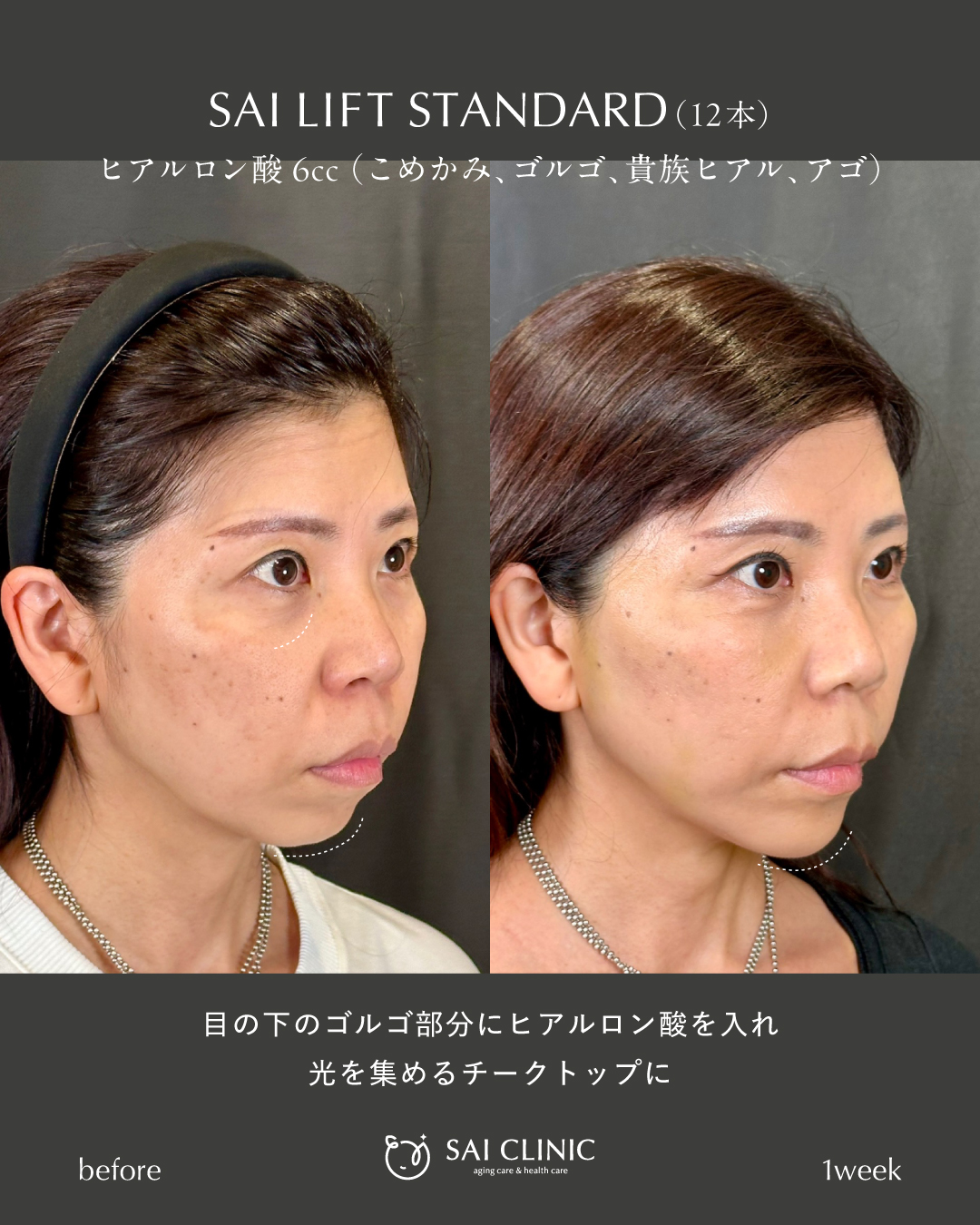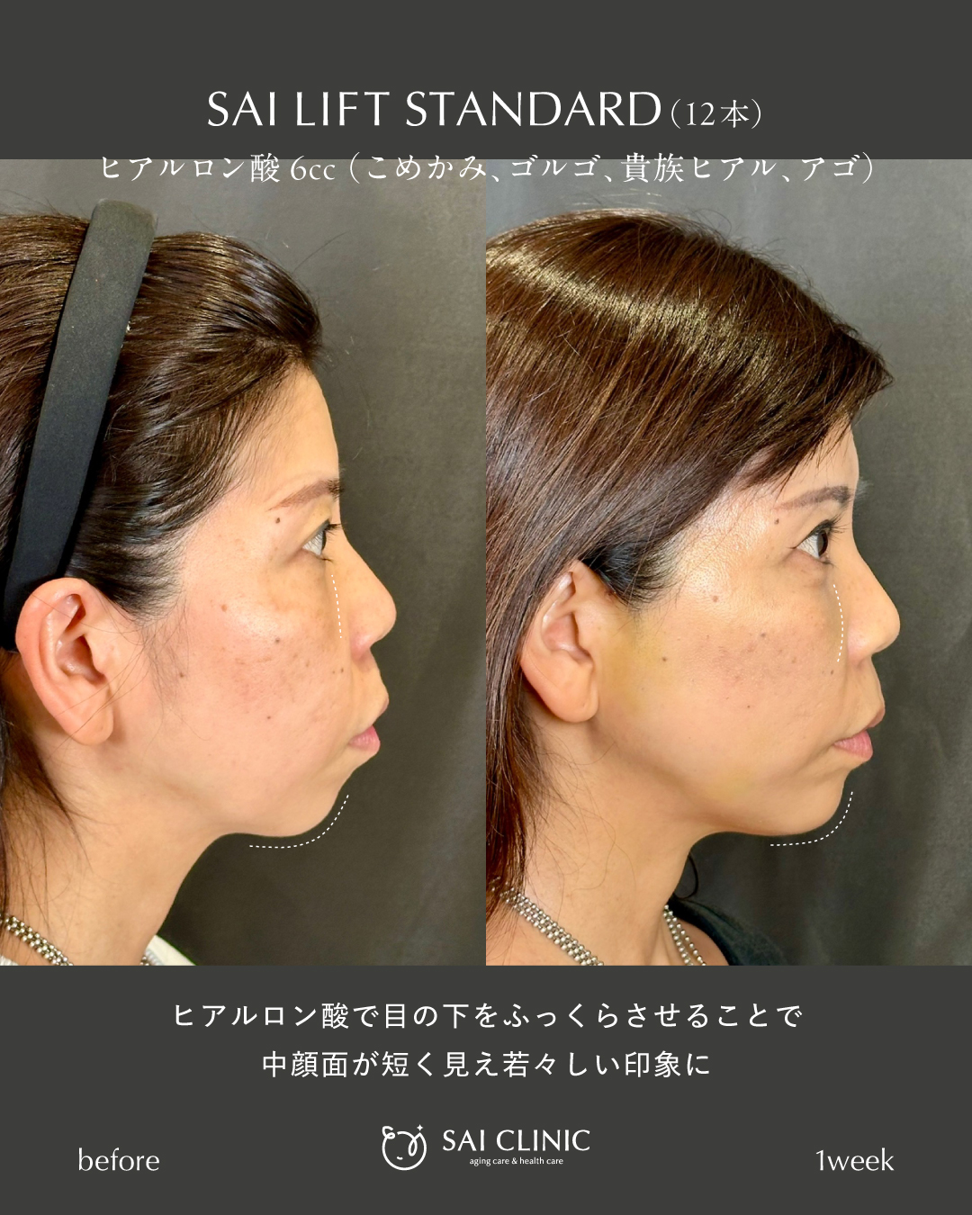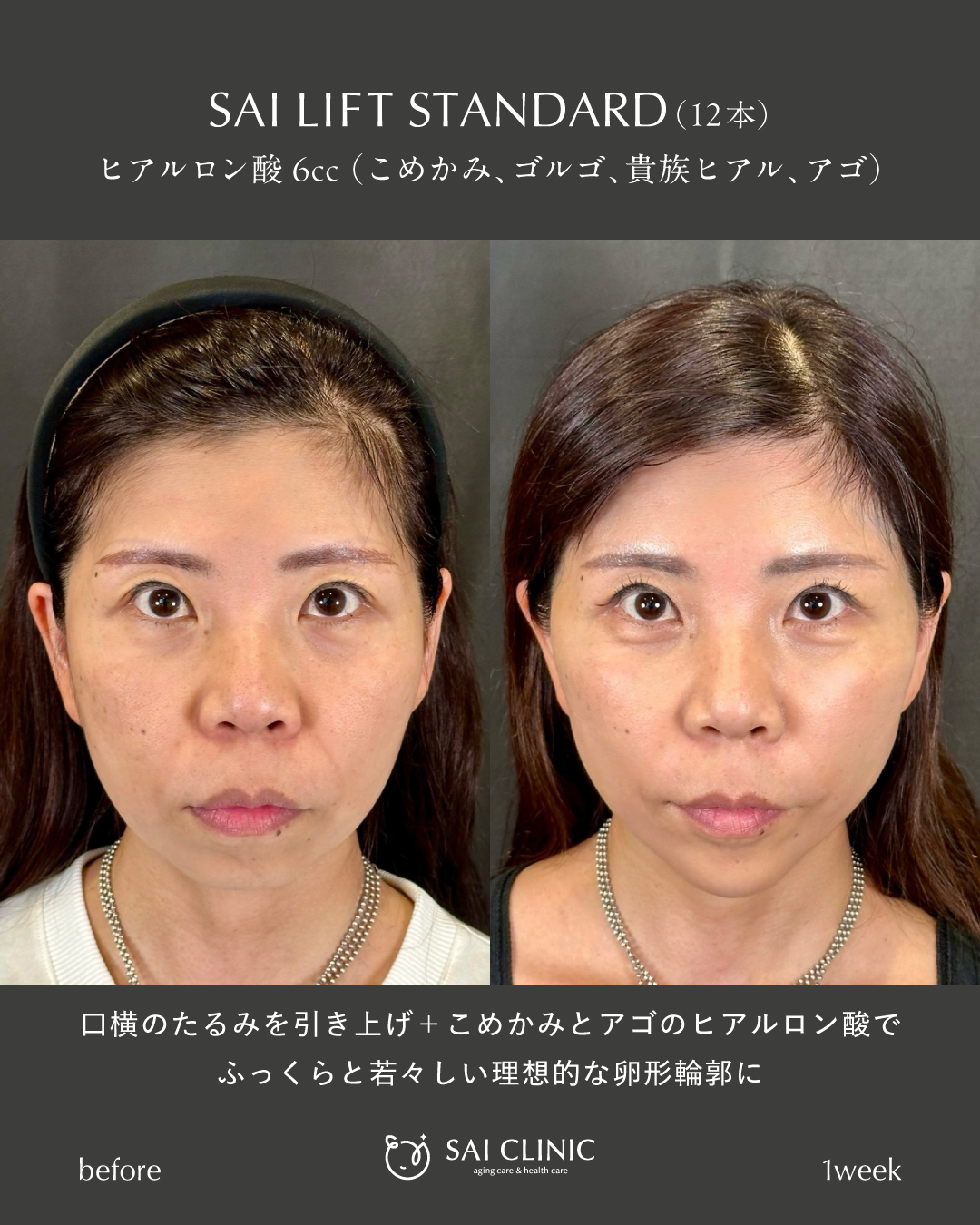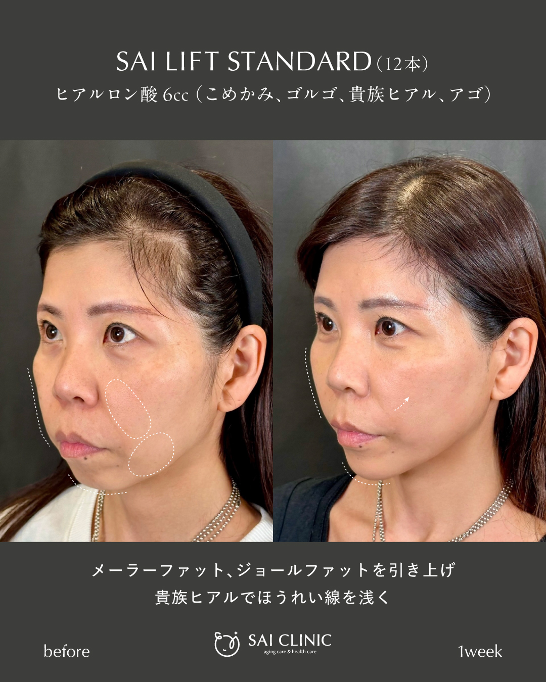 | 施術名 | 糸リフト(SAI LIFT STANDARD)12本 ヒアルロン酸(こめかみ、ゴルゴ線、ほうれい線、アゴ)6cc |