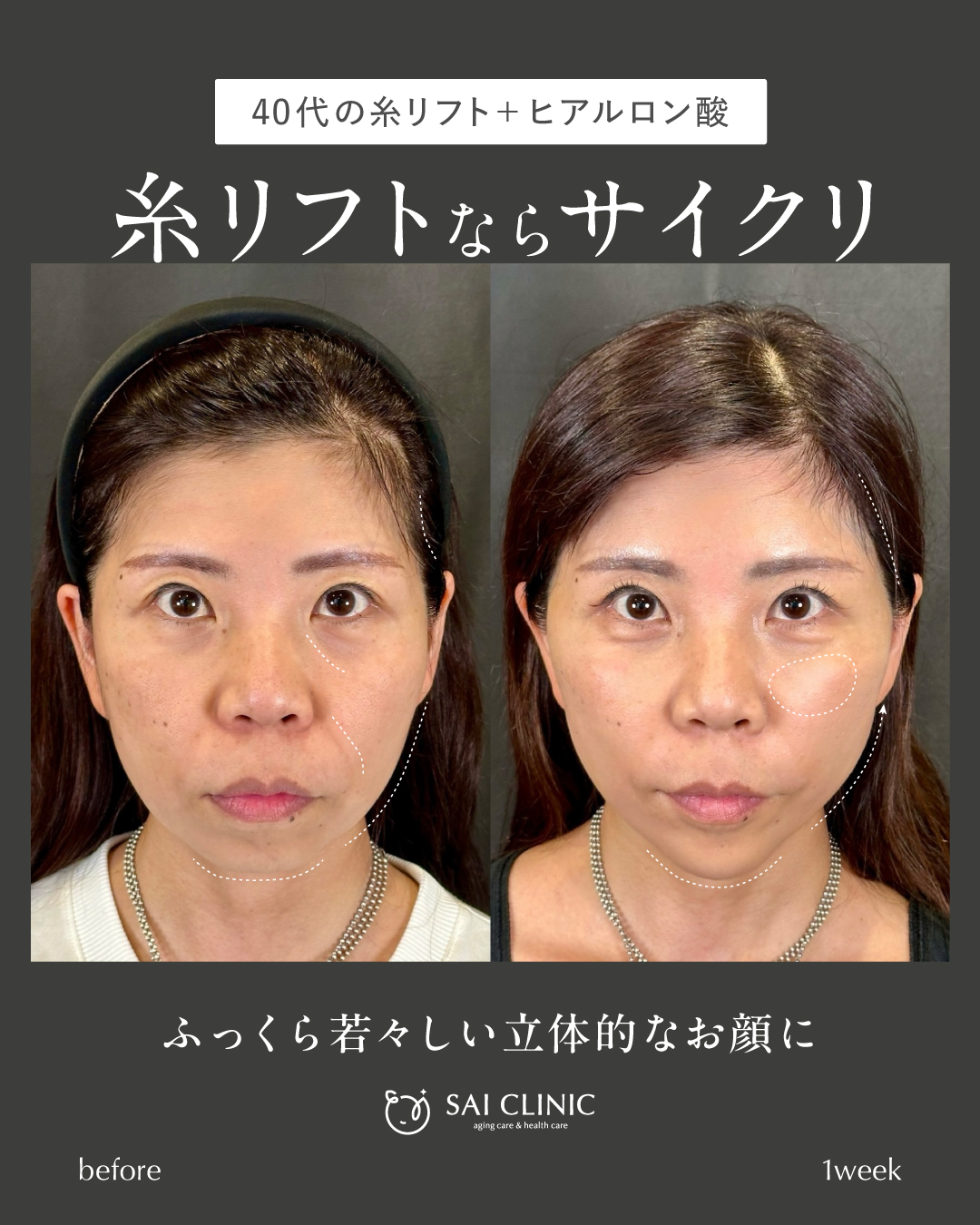 | 施術名 | 糸リフト(SAI LIFT STANDARD)12本 ヒアルロン酸(こめかみ、ゴルゴ線、ほうれい線、アゴ)6cc |