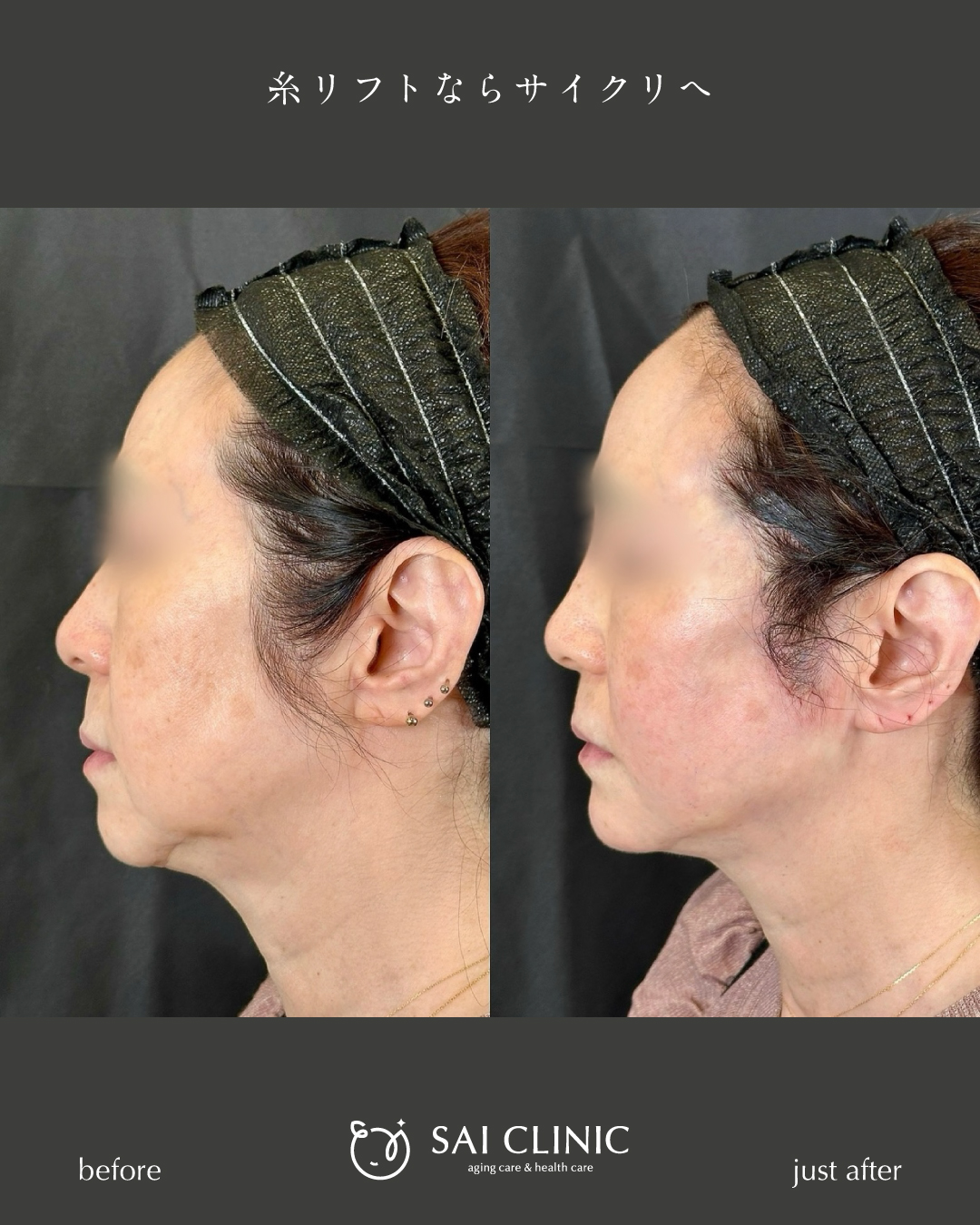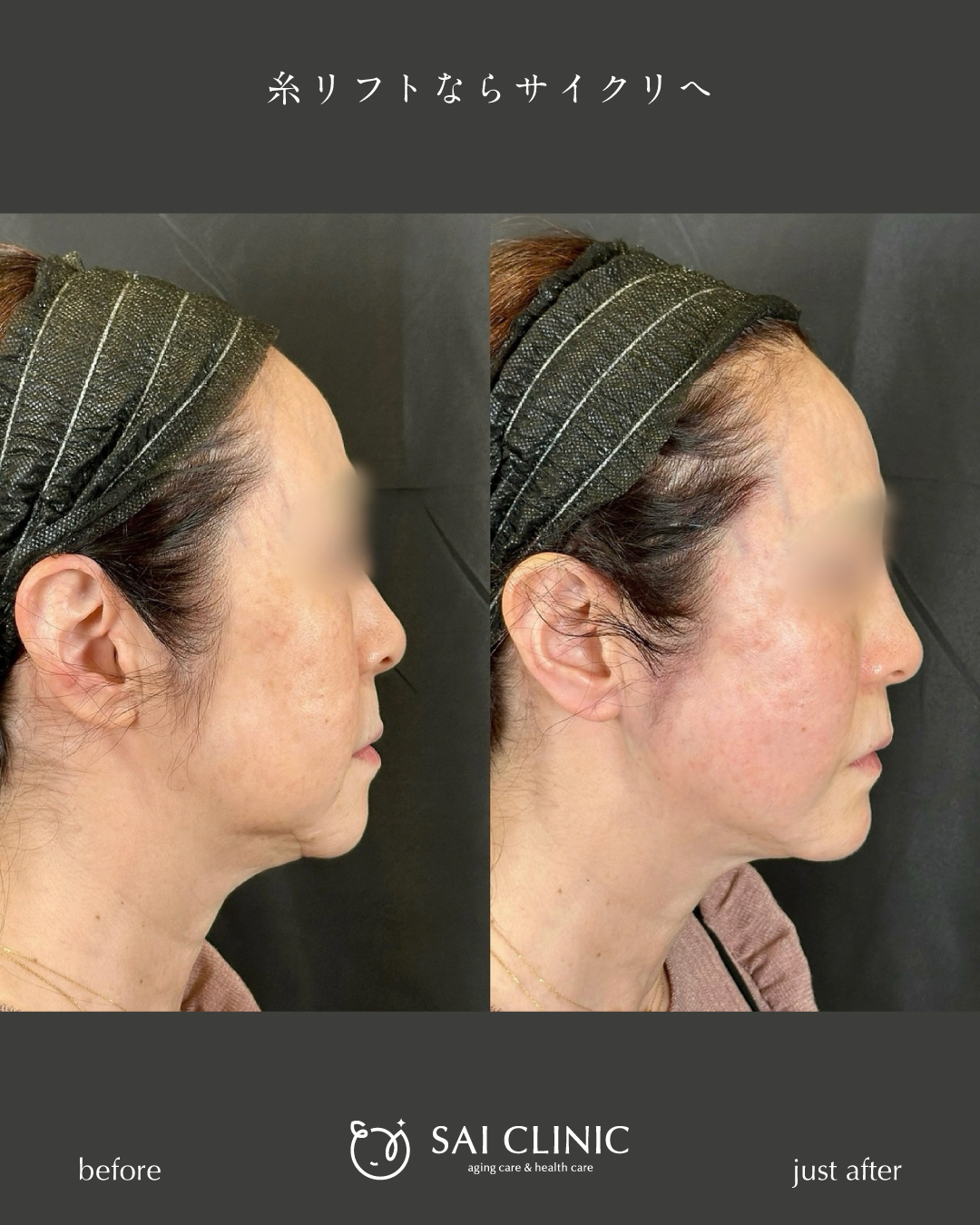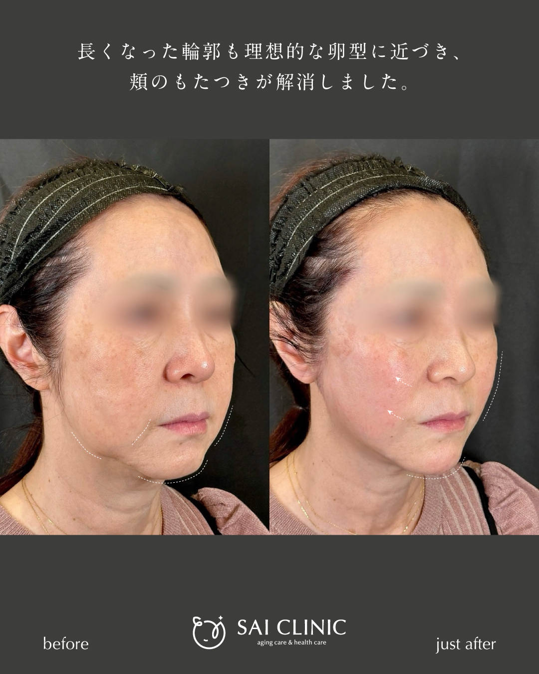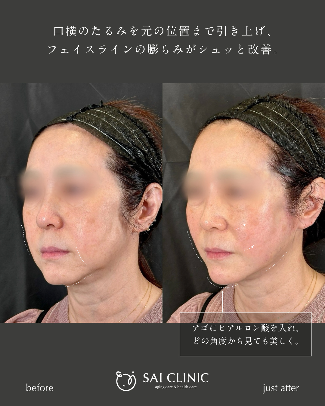 口横のたるみを元の位置まで引きあげる事で、フェイスラインの膨らみもシュッと改善し、長くなった輪郭も理想的な卵型に近づきます。