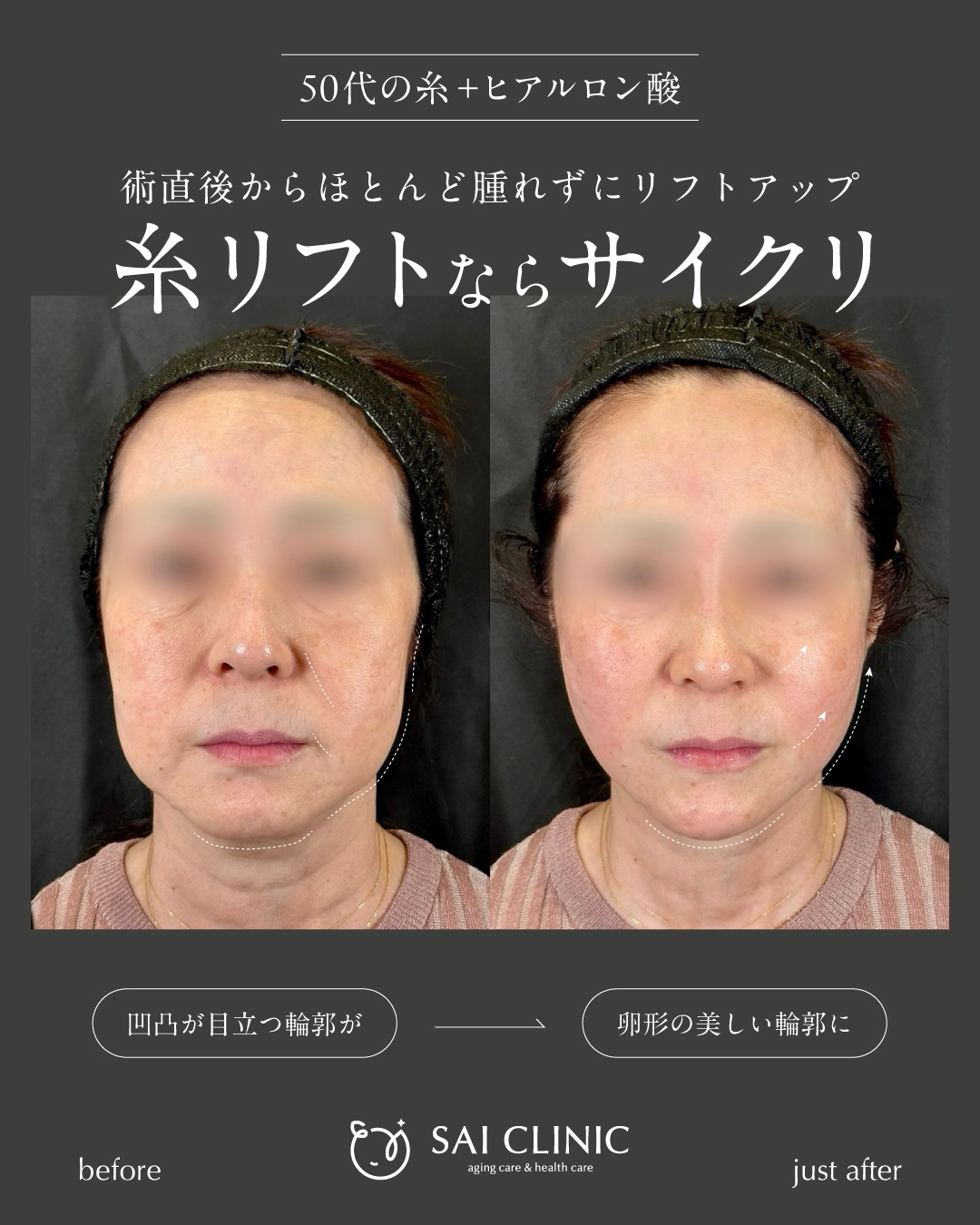 施術内容 [糸リフト]溶ける糸を顔に挿入したるみを引き上げ、コラーゲンを産生し肌質を改善する施術です。[ヒアルロン酸]ヒアルロン酸を気になる部位に注入してボリュームを出し、シワやハリ・肌質を改善する施術です。
