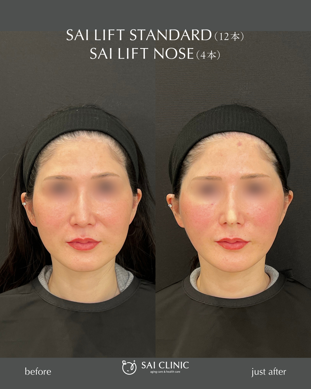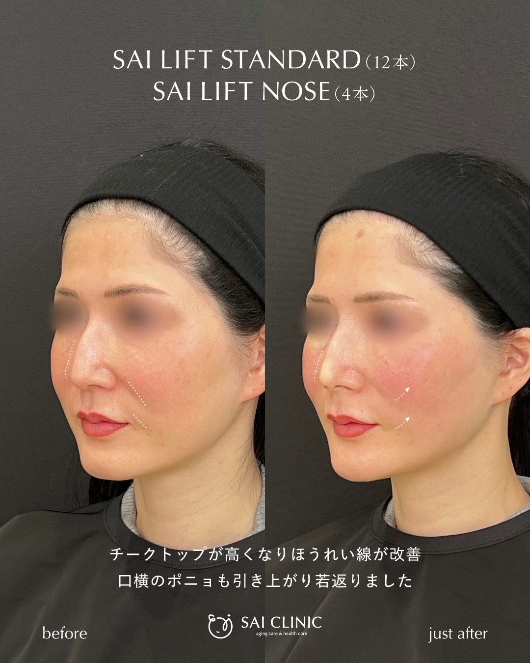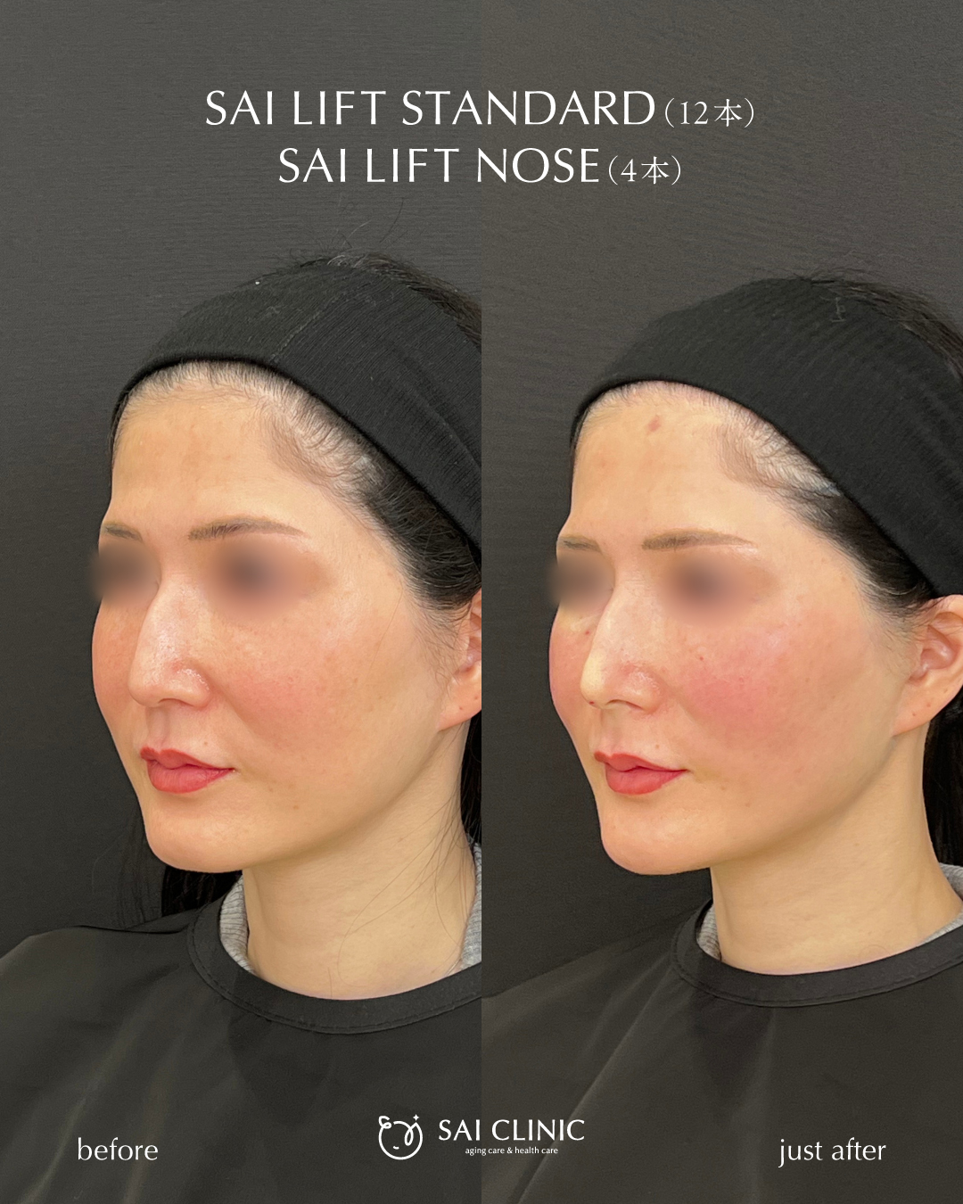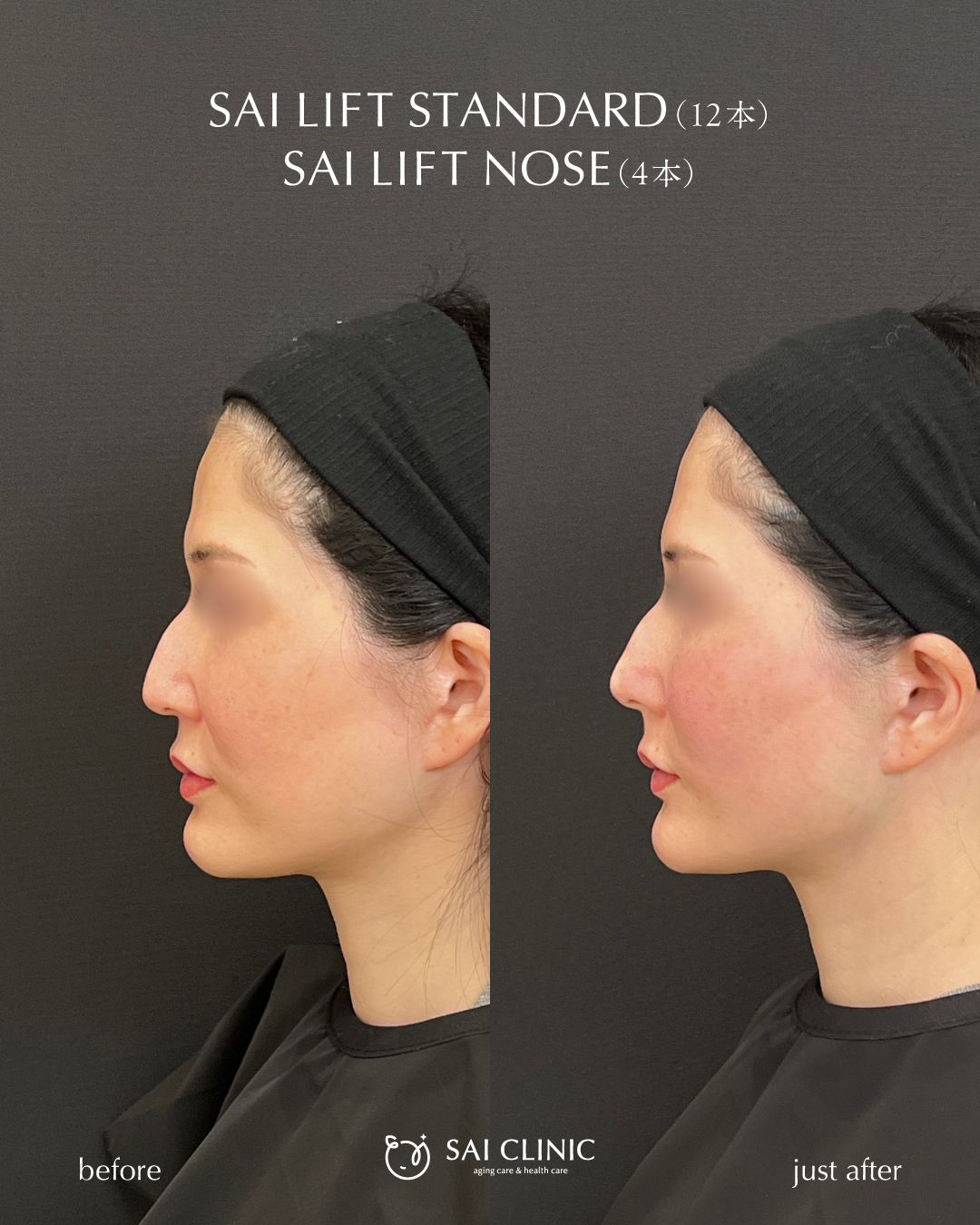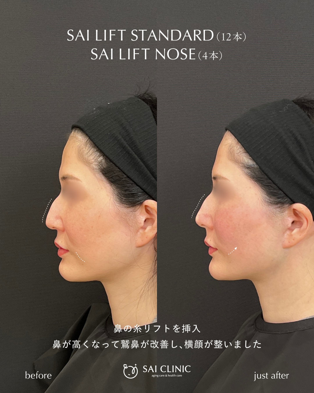 また、鼻に高さを出す糸リフト「SAI LIFT NOSE」で鼻先が高くなって鷲鼻が目立たなくなり、横顔がとても綺麗に整いました。
