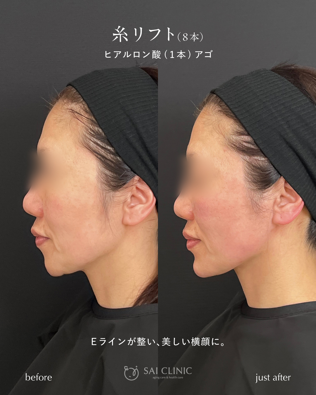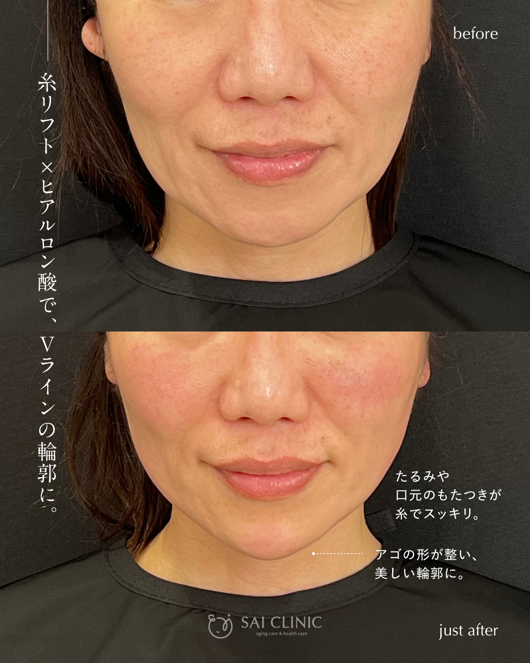 - 溶ける糸を顔に挿入したるみを引き上げ、コラーゲンを産生し肌質を改善する施術です。