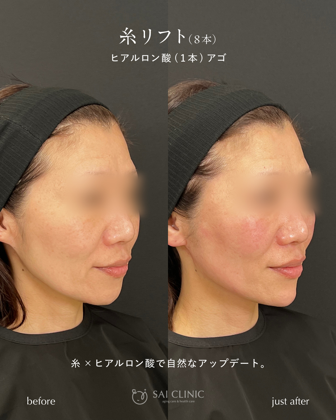 - [糸リフト]溶ける糸を顔に挿入したるみを引き上げ、コラーゲンを産生し肌質を改善する施術です。
