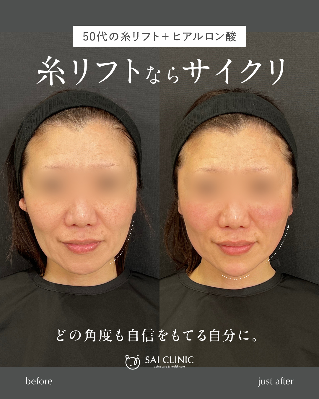 - [糸リフト]溶ける糸を顔に挿入したるみを引き上げ、コラーゲンを産生し肌質を改善する施術です。