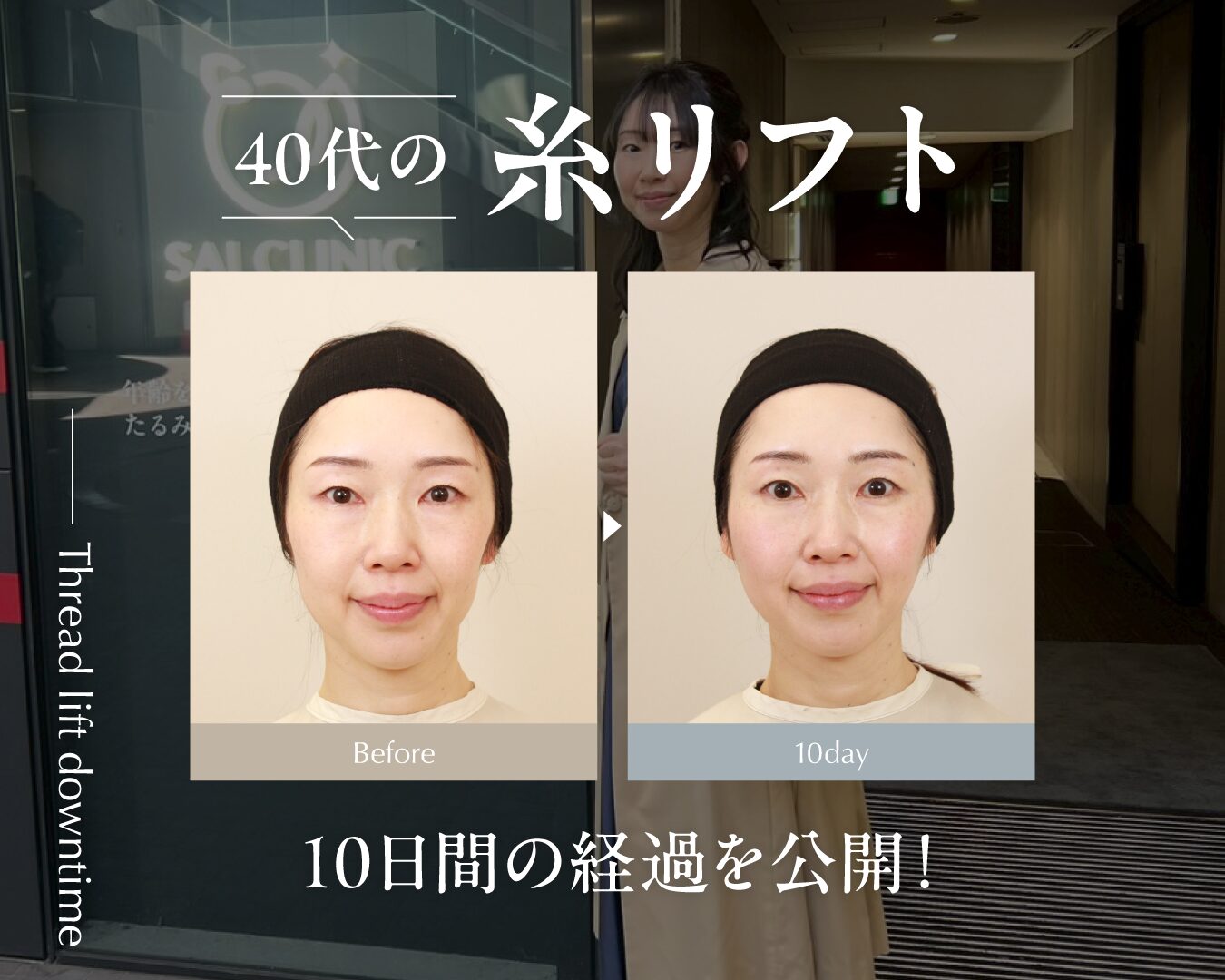 糸リフトを受けられたモニター様にご協力いただき、糸リフトの施術当日から10日目までの経過を、症例写真とモニター様のコメントとともにまとめました。