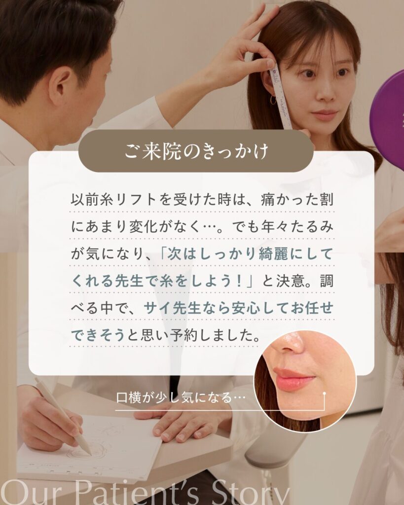 「今度はちゃんと信頼できる先生にしてもらおう」と、検索やInstagramでたくさんの医師やクリニックを調べられる中でSAI CLINICを見つけてくださり、人生2回目の糸リフトは当院にお任せいただくことになりました。
